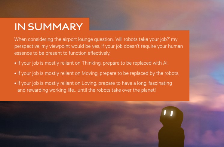 I won’t bore you with their thinking here as they largely focused their conversation on which of the two of them was most at risk in their role being taken over by Artificial Intelligence or Robots (one was an accountant, the other a national strategic planner).